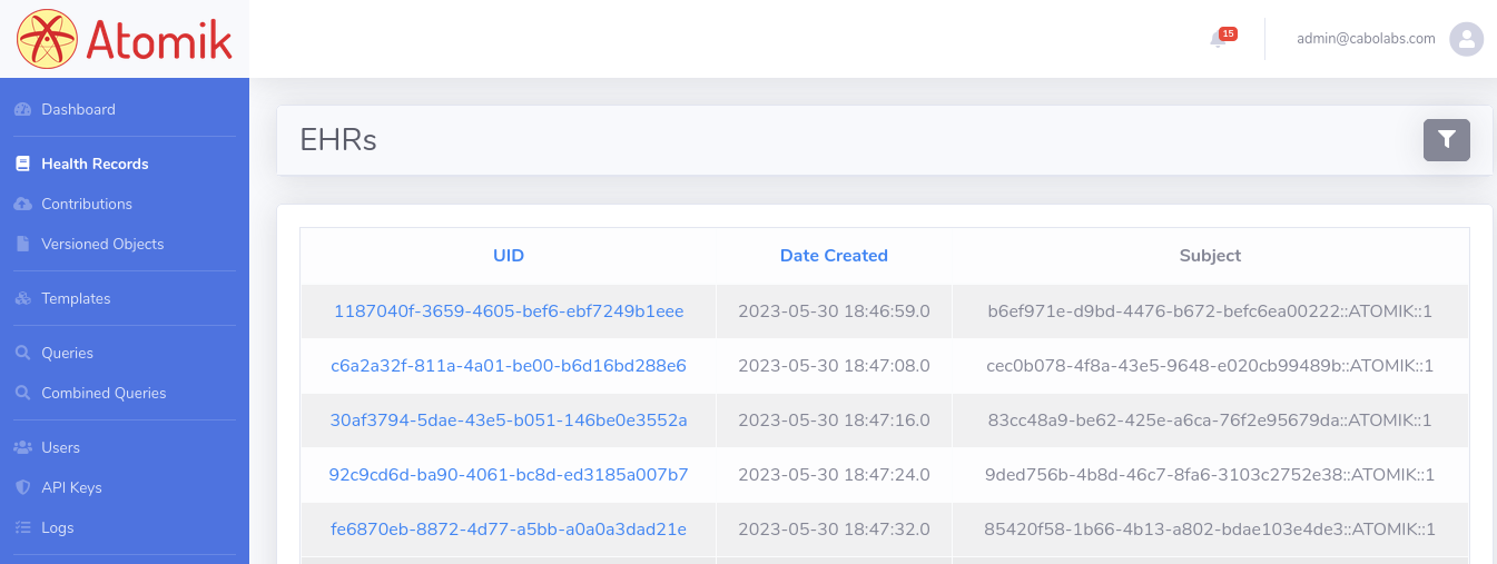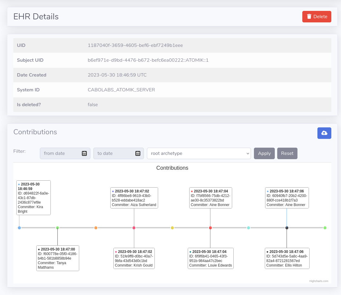 The EHRs or Health Records section allows to manage all the EHRs stored in the Atomik. An authenticated user can list all EHRs and see their details: it's ID, the data it was created and the ID of the patient each EHR belongs to. On the EHR details view, there is more data plus a timeline chart showing the contributions to that EHR, and you have access the details of each contribution from there.