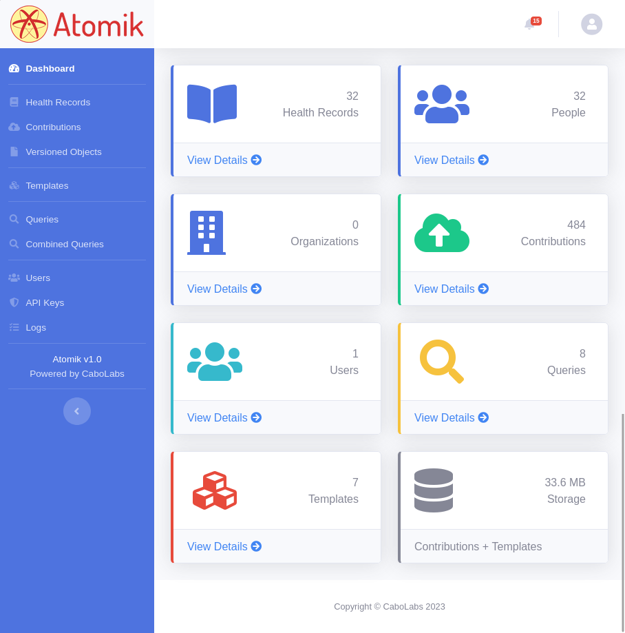 Atomik's web console is a very intuitive user interface for administrators to manage, configure, audit and test different aspects of Atomik, including: users, clusters, EHRs, demographics, contributions, folders, compositions, templates, queries and logs.